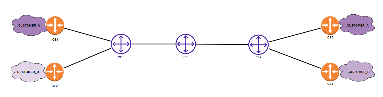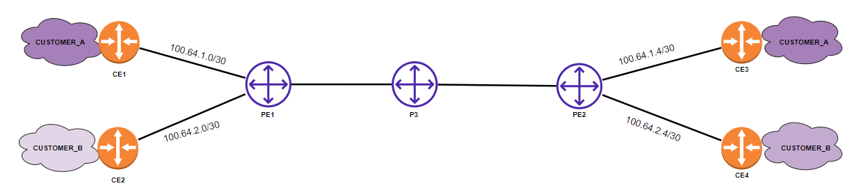 Our L3VPN service is now up and running. Feel free to verify that the CEs of each customer can reach other on their loopbacks (which are being advertised into BGP).