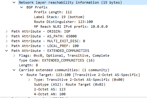 Here is the Update for the CUSTOMER\_A route. As you can see, the RD does *not* have a type field. It is simply the value itself, 123:100. However, the RT *does* have a type field. The router determined that we are using type 0 (2 byte ASN: NN ) automatically, and set the type code on the ext community when advertising the Update.